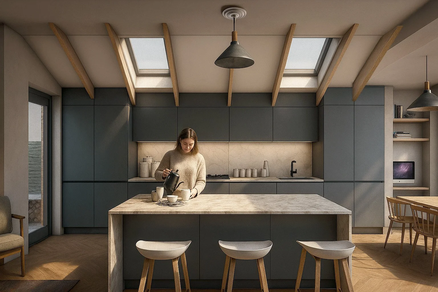 Large, carefully positioned glazing pulls natural light deep into the centre of the home and frames views out to the extended garden. A deep picture window and seat create a quiet spot to read or watch the kids play, while slim-framed sliding doors open directly onto the terrace for outdoor eating in warmer months. Rooflights over the kitchen and dining zone bring in high-level daylight and animate the space through changing shadows over the course of the day.