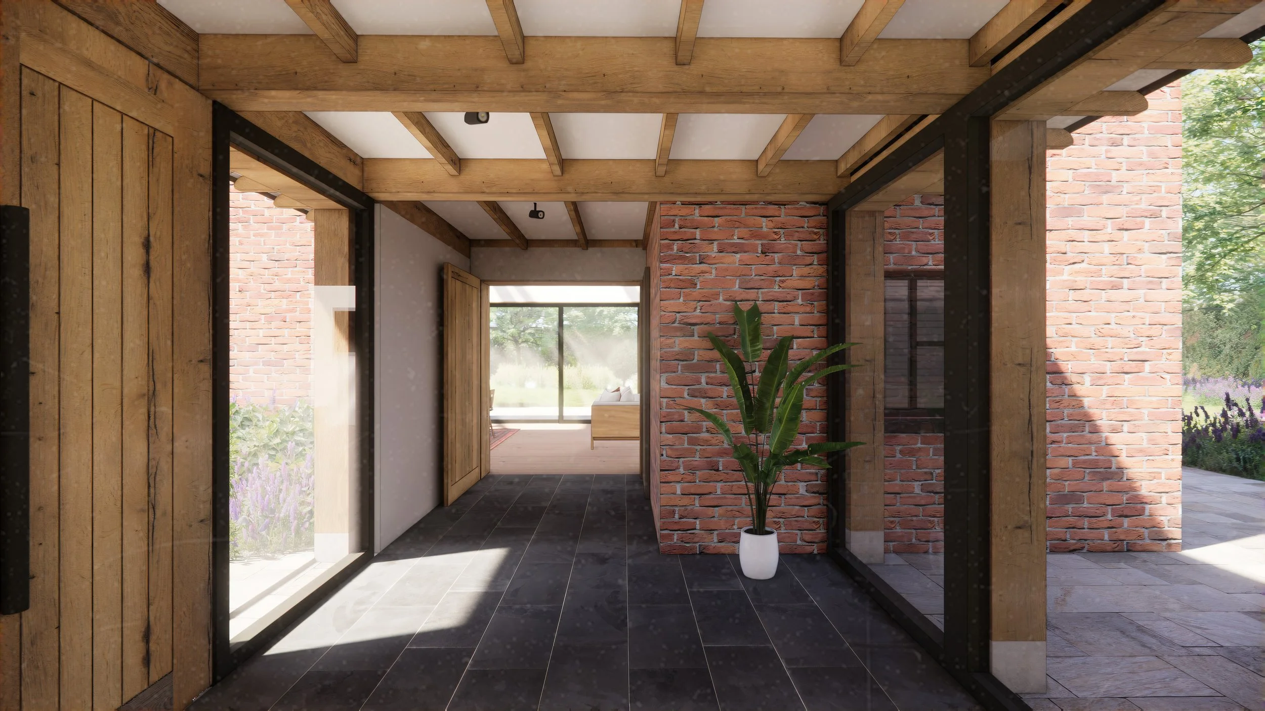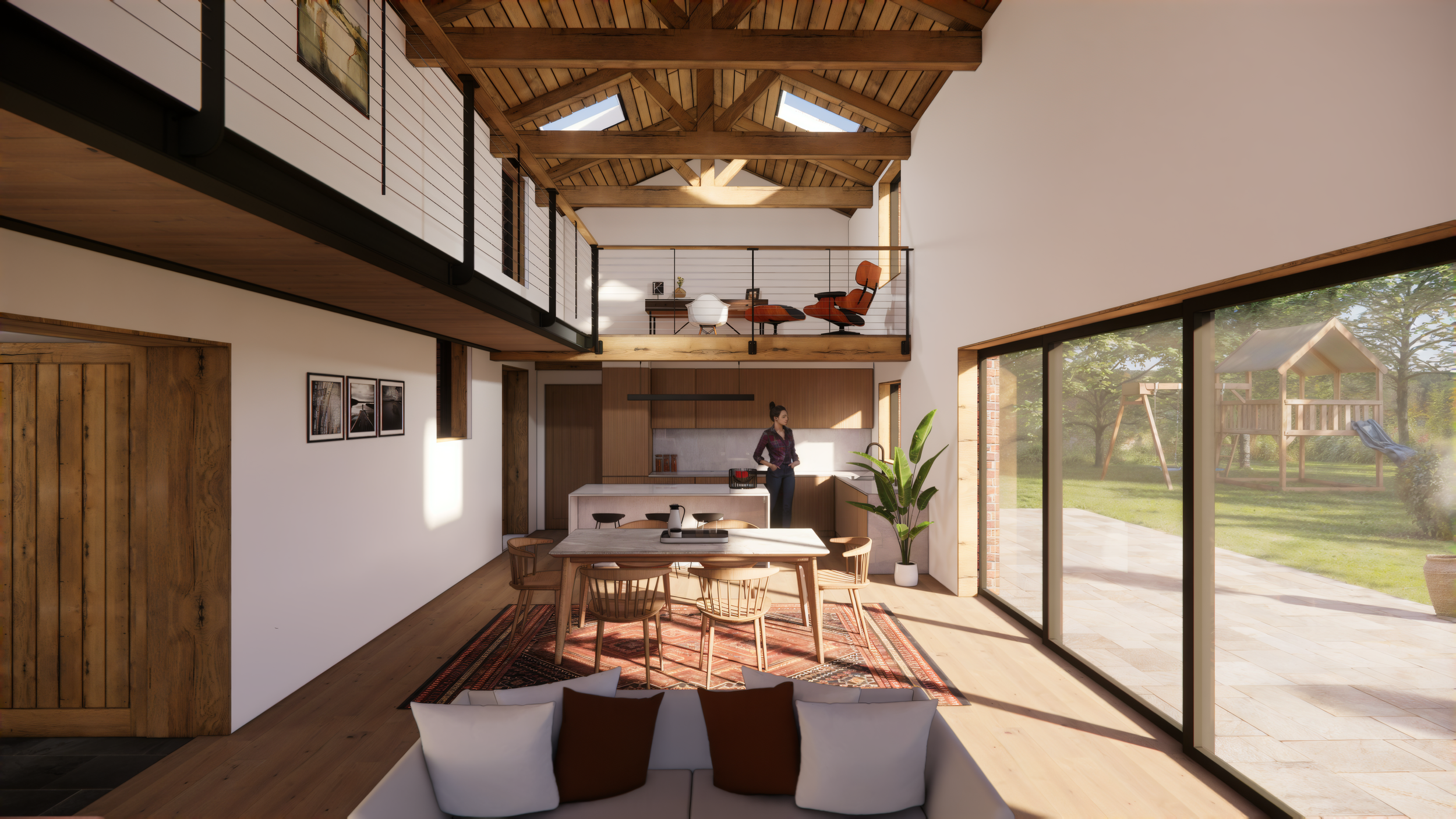 A new, clearly defined front door is created with a light-touch timber-framed link between house and mill. High-performance glazing, matching clay tiles and a simple pitched form keep the connection calm and recessive, framing views through to trees and planting. Inside the barn, a generous kitchen–dining–living space with mezzanine gallery opens up under repaired and exposed trusses, with carefully enlarged openings drawing daylight in and connecting straight out to the garden terrace.
