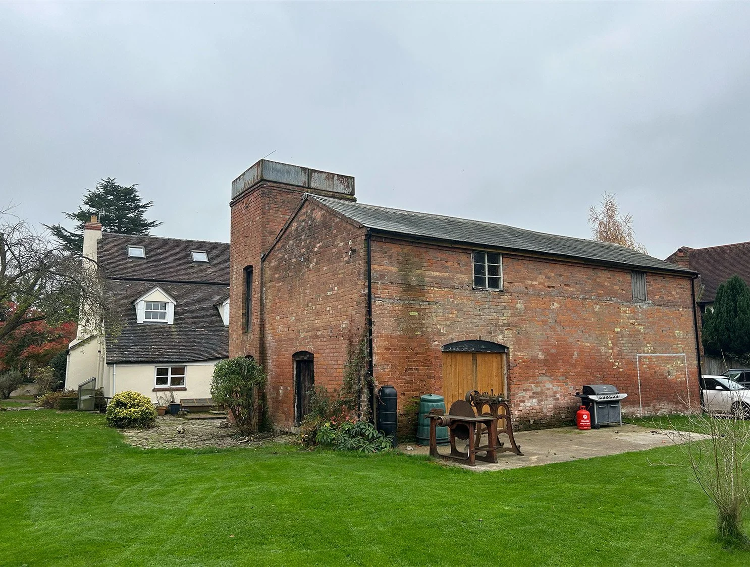 Our clients loved the character of their former cider barn, but in reality it was doing little more than storing garden tools. The main house and barn sat as two separate worlds: a formal Georgian-fronted home on one side, a hardworking brick mill on the other, with no clear front door and very little relationship to the generous garden