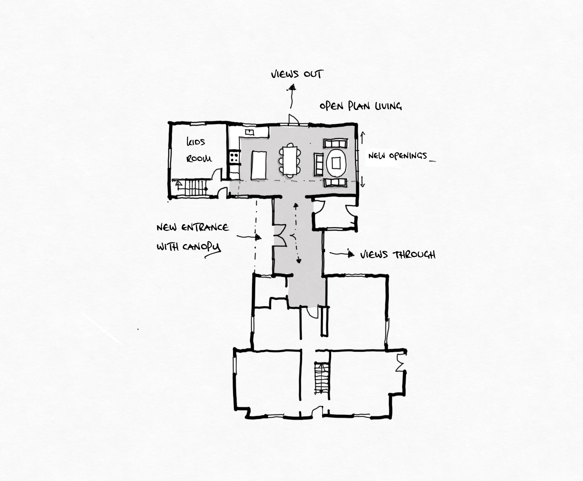 We began by studying how the family already moved between house, barn and garden, mapping these “desire lines” to let the new layout grow from what was already there. Existing openings set the rhythm, so the architecture works with the grain of the buildings rather than against it.